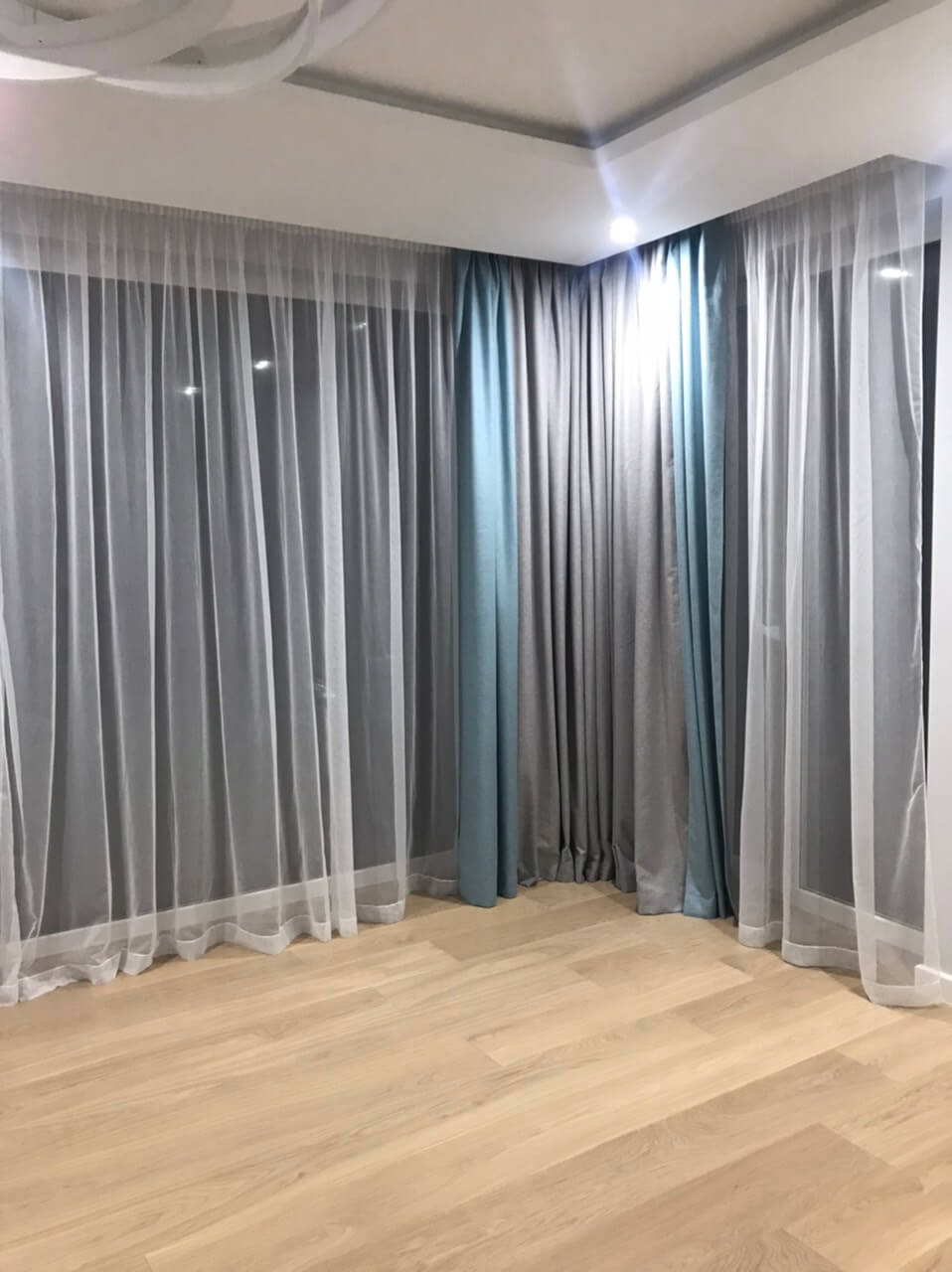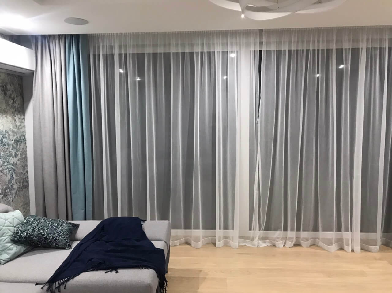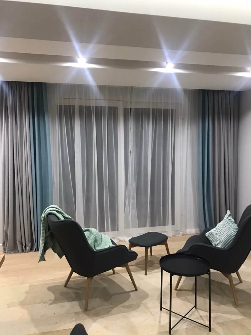 House near Warsaw. Curtains and drapes for the living room and dining room. We used light white DEKOMA curtain fabric and MARGO drapery fabric in two colors. We wanted to match the color of the curtains to the wallpaper color on one of the walls, so we added a turquoise trim.