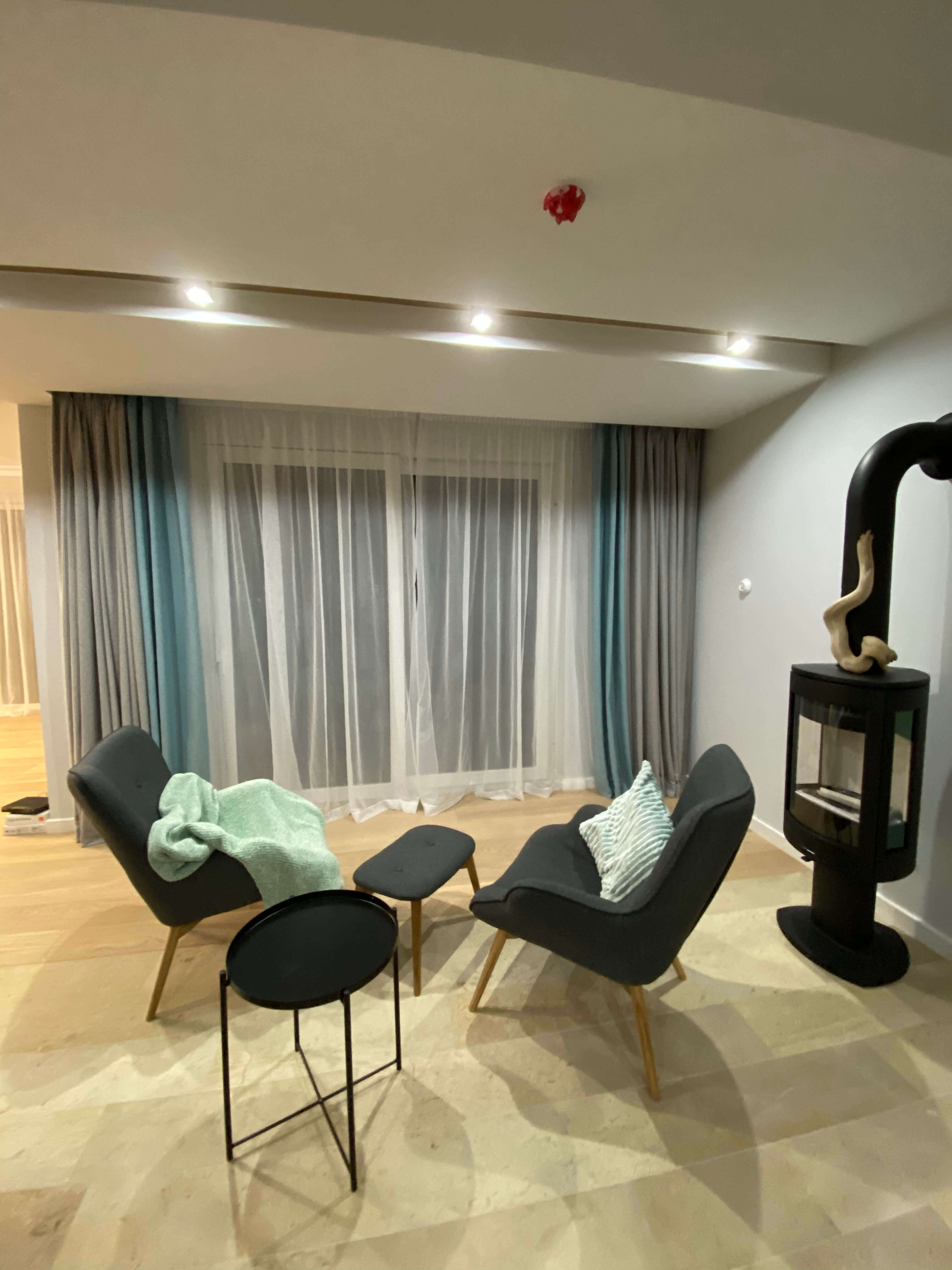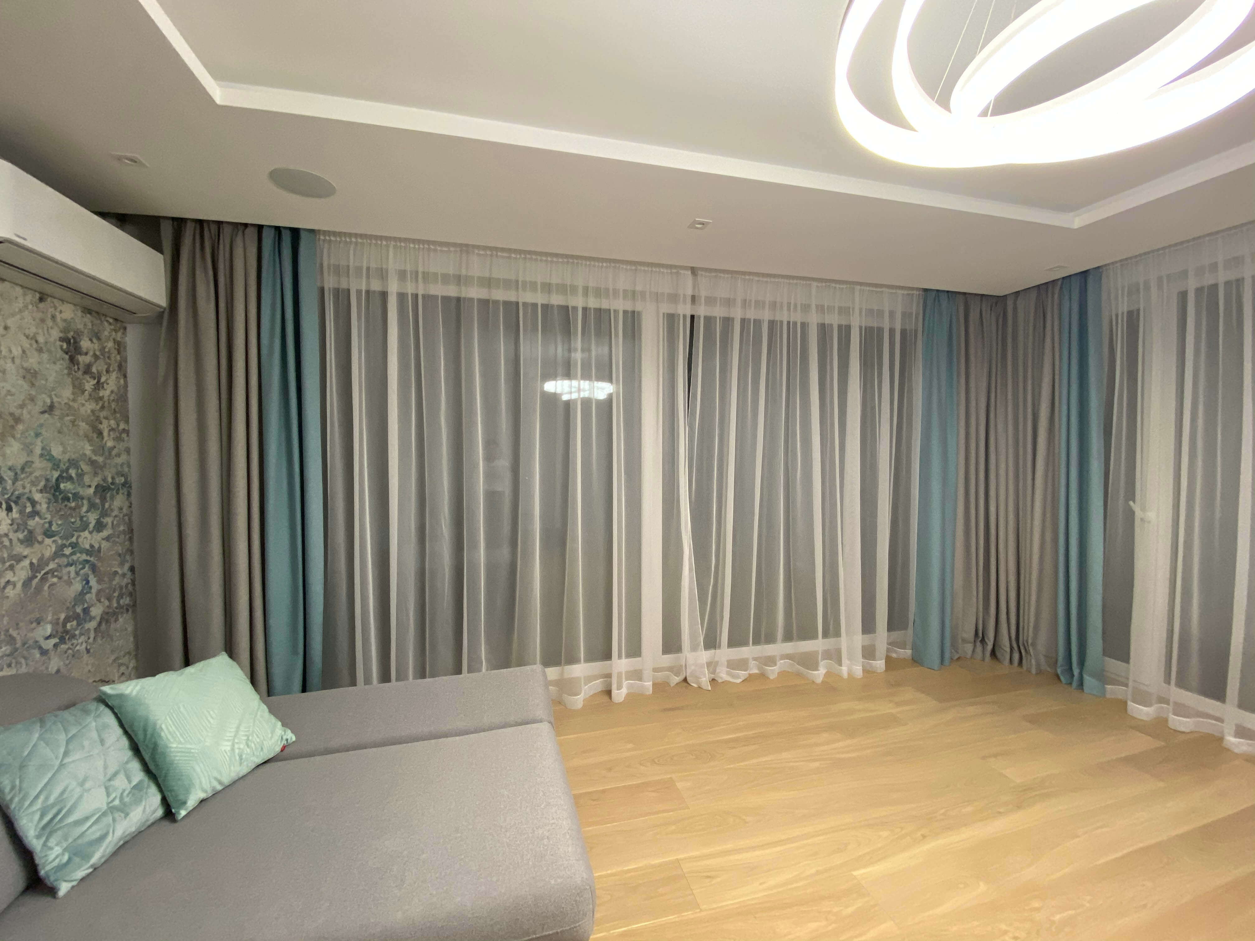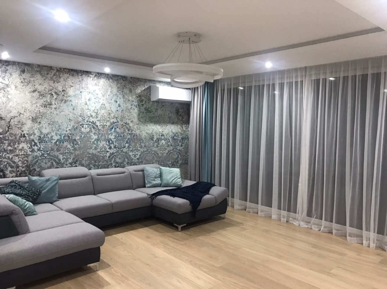 House near Warsaw. Curtains and drapes for the living room and dining room. We used light white DEKOMA curtain fabric and MARGO drapery fabric in two colors. We wanted to match the color of the curtains to the wallpaper color on one of the walls, so we added a turquoise trim.