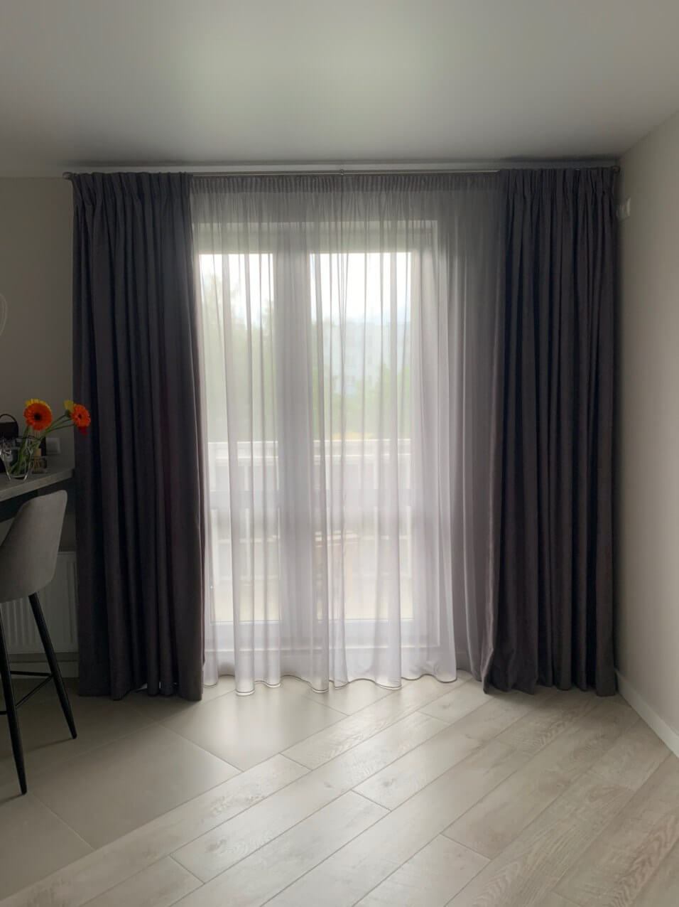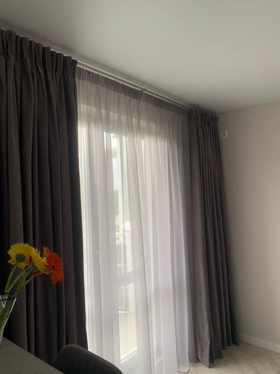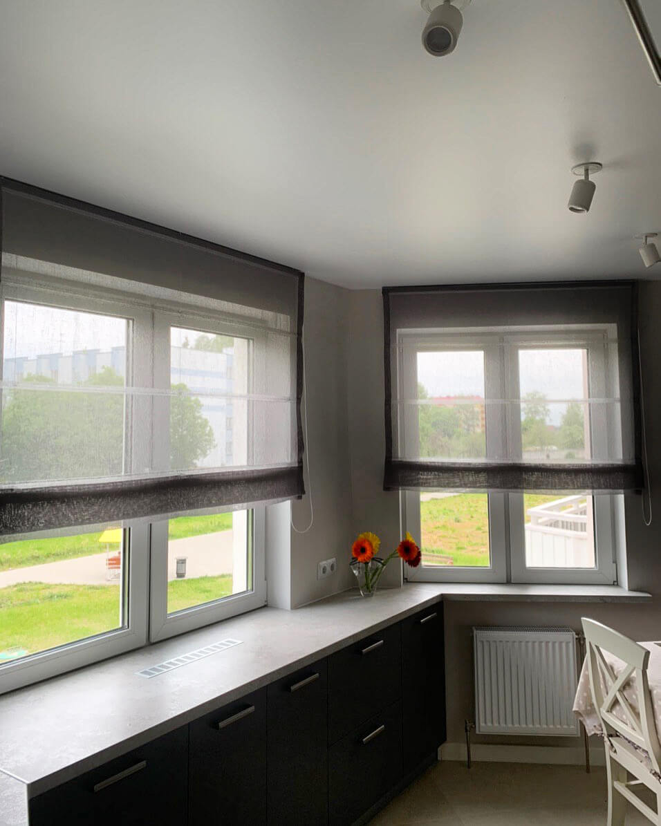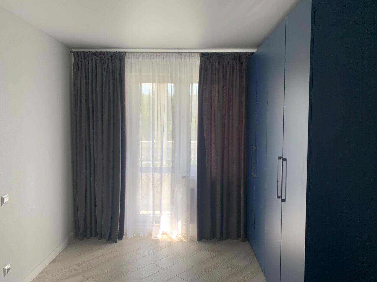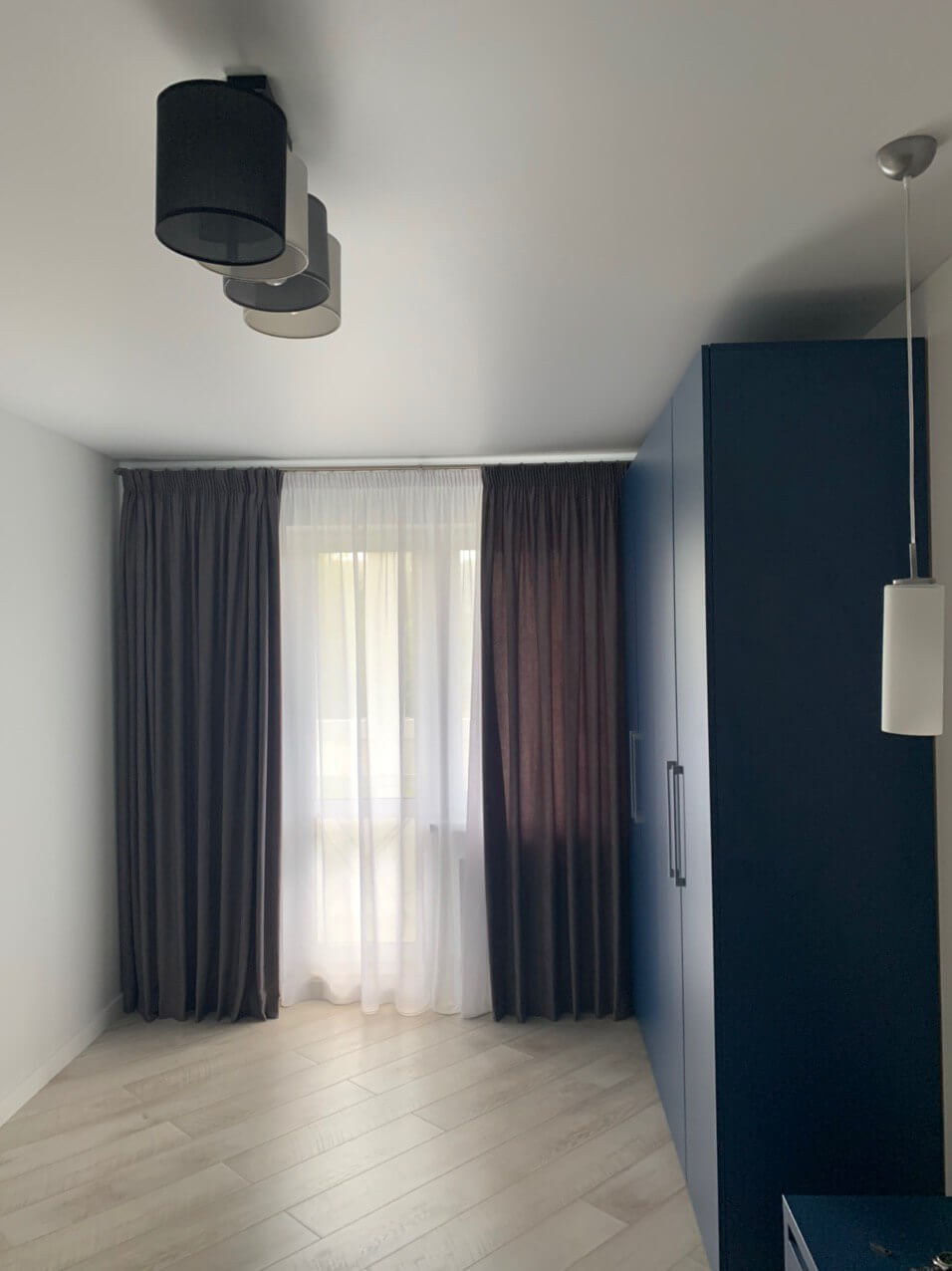 An apartment in a modern style. When selecting fabrics for this interior, we focused on natural, washable materials. In the kitchen, there are Roman blinds in a beautiful anthracite color, and in the living room and bedroom, there are curtains made of Dimout fabric, which does not allow light to pass through.